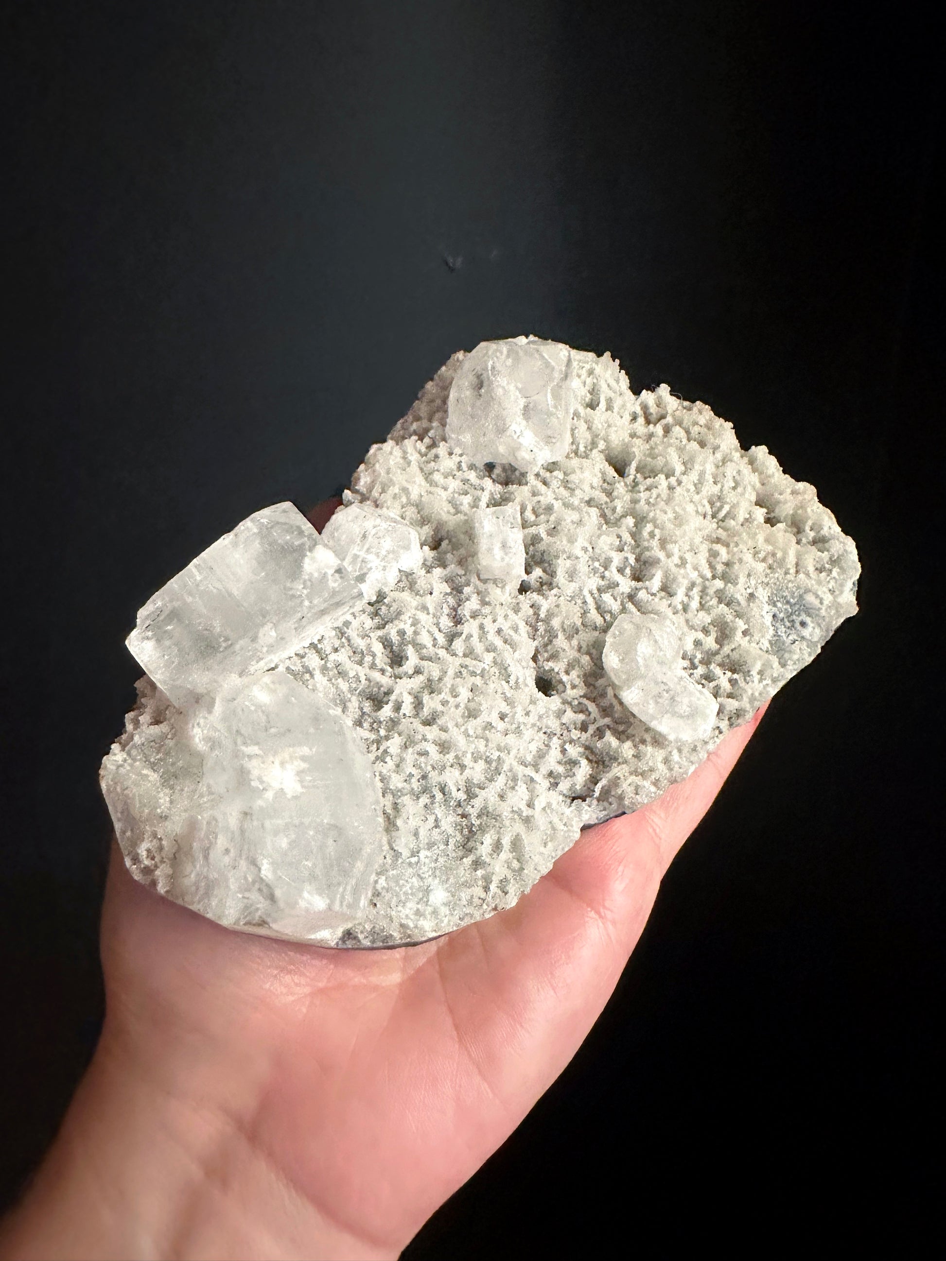 Apophyllite crystals on a bed of mini Chalcedony stalactites, reminiscent of oceanic landscapes.