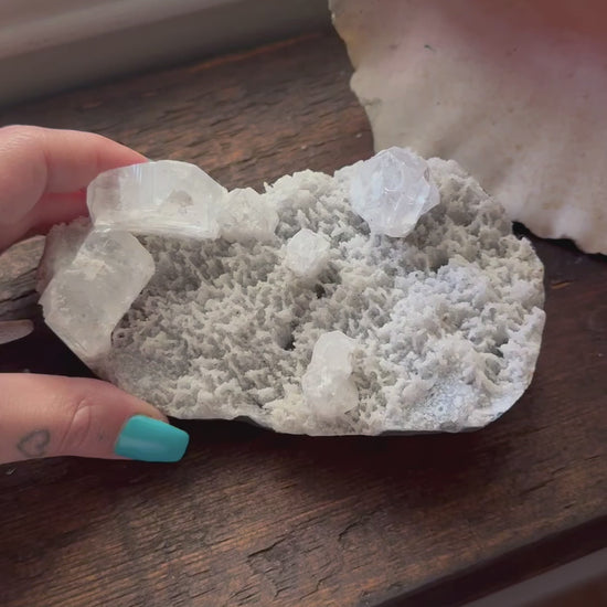Apophyllite is a very high vibrational stone that activates the crown chakra. It’s energy attracts angels and light beings in abundance. It will fill your home with beautiful white light and protect you from negative forces. Apophyllite is a gateway to higher dimensions, helping one on their path toward higher states of consciousness. This crystal alleviates stress and anxiety as it reminds one of their innate divinity & connection to the creator. Malicious or low vibe frequencies will be transcended into the light immediately by this stone. Keeping an Apophyllite Cluster in frequented rooms is recommended as it can maintain pleasant feelings & keep the energy clean. Apophyllite doesn’t need to be ‘cleansed’ and can be used to raise the vibrations of other crystals.