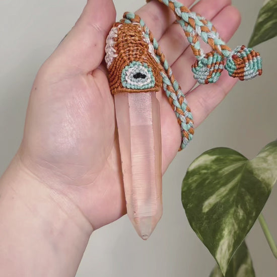 This one‑of‑a‑kind Tangerine Quartz evil eye amulet is hand‑woven in teracotta, turquoise, aqua and white cord.
